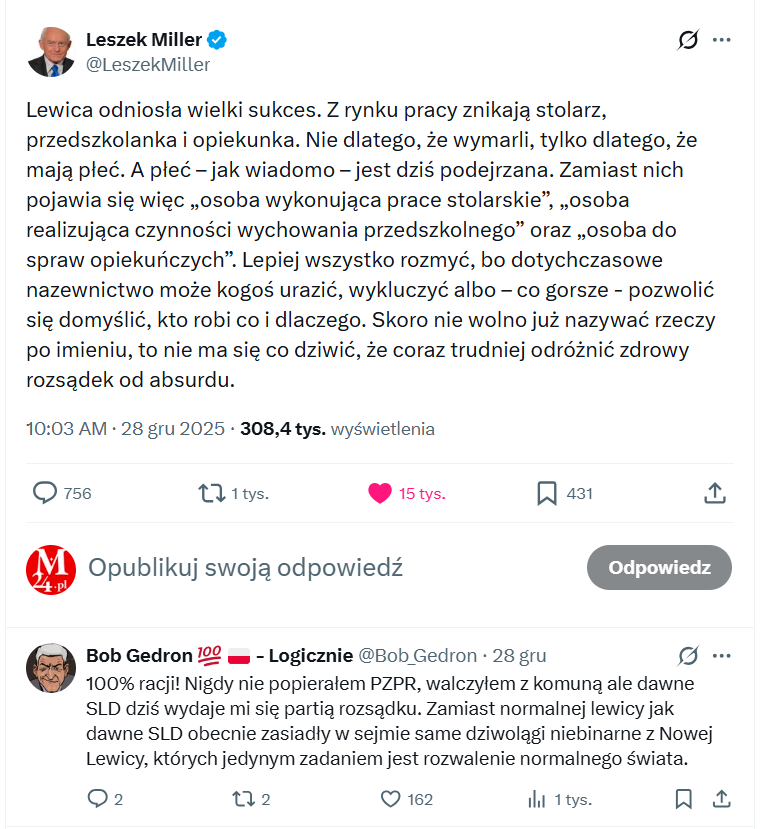 „Lewica odniosła wielki sukces. Z rynku pracy znikają stolarz, przedszkolanka i opiekunka. Nie dlatego, że wymarli, tylko dlatego, że mają płeć. A płeć – jak wiadomo – jest dziś podejrzana. Zamiast nich pojawia się więc „osoba wykonująca prace stolarskie”, „osoba realizująca czynności wychowania przedszkolnego” oraz „osoba do spraw opiekuńczych”. Lepiej wszystko rozmyć, bo dotychczasowe nazewnictwo może kogoś urazić, wykluczyć albo – co gorsze – pozwolić się domyślić, kto robi co i dlaczego. Skoro nie wolno już nazywać rzeczy po imieniu, to nie ma się co dziwić, że coraz trudniej odróżnić zdrowy rozsądek od absurdu”.